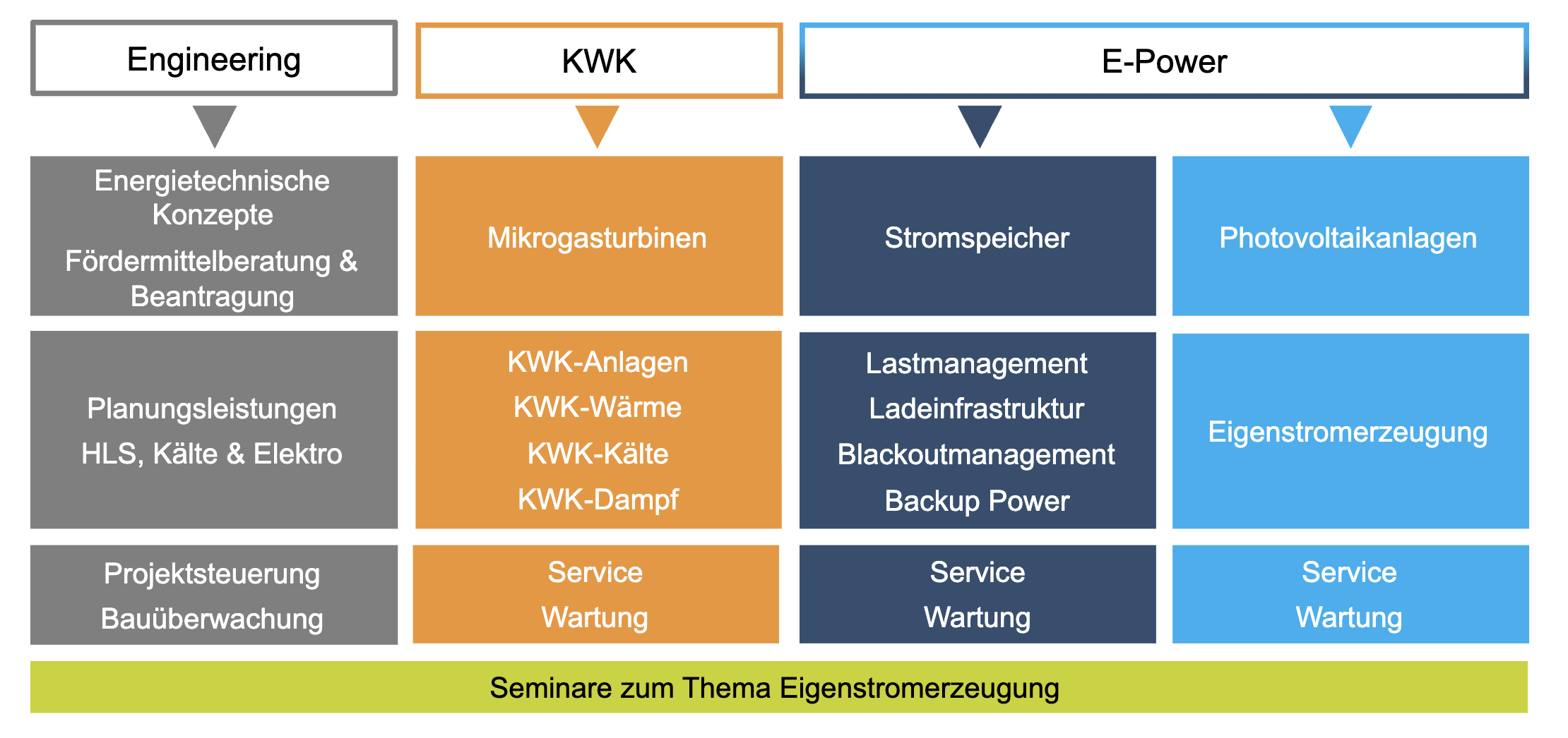 Es werden kundenspezifische Lösungen entwickelt, die Energiebedarfe (Strom, Wärme und Kälte) zukunftsweisend, kostengünstig und mit anteiliger Eigenenergie decken zu können.